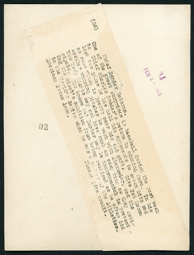 Photographer/AgencyAmerican Press AssociationImage Datec. 1916-1917Print DateOriginal print c. 1916-1917Notes/Stampings on ReverseAPA paper slugCard/Publication Use1961 Fleer card imageLocationUndeterminedDimensions6 in. x 8 in.MediumPhotograph - Vintage gelatin silver printProvenanceUnknownStatusRetained in The Chapman Deadball CollectionShare