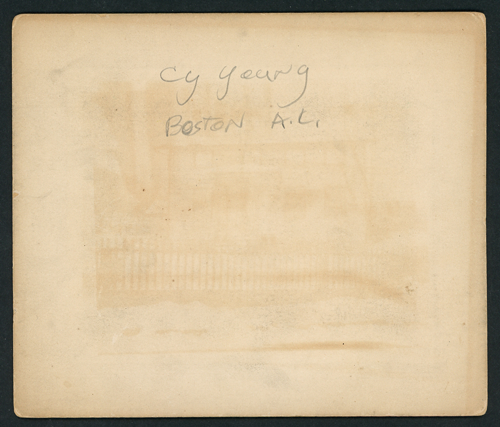 1908 mounted image of Cy Young by George Grantham Bain’s news service. The “red sock” on front was only worn in 1908 and this image was used to market the 1908 “Cy Young Day” at the Huntington Grounds in Boston. It was used on a postcard that was likely issued to fans.