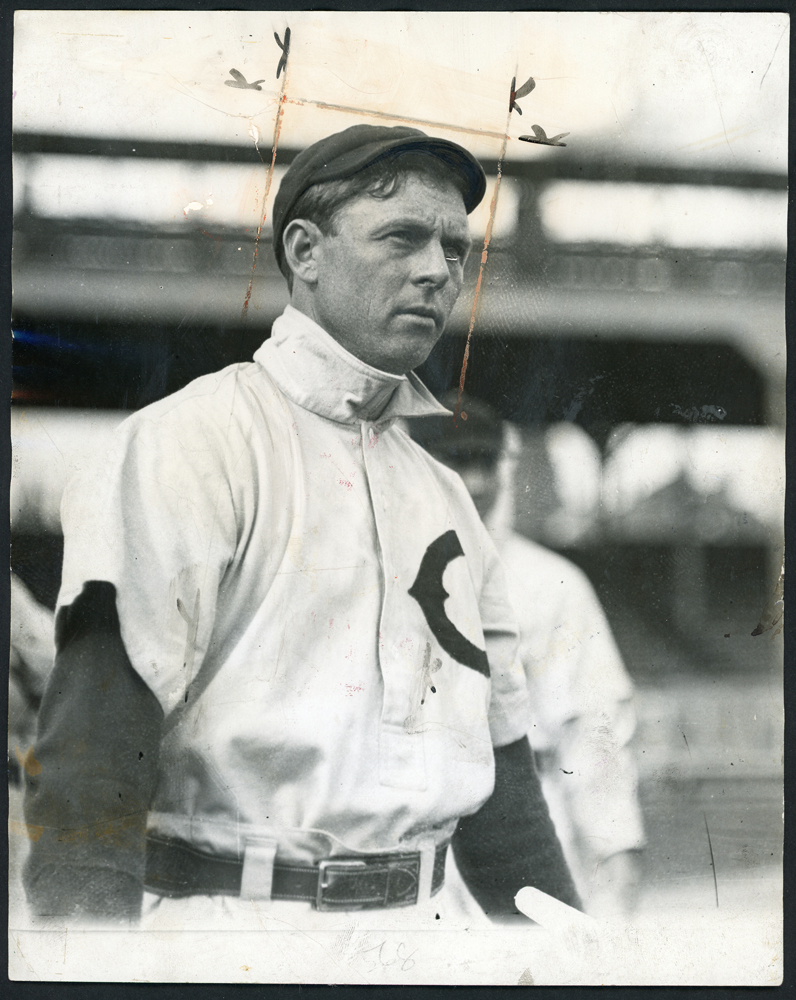 This image comes from the archives of the Chicago Daily News. The negative is located in the Chicago History Museum and indicates the shot is of Brown at the West Side Grounds during the 1907 World Series. This print is from the original negative but likely printed later. The orange editing marks were from an early 1940’s newspaper article as shown on the back of the print.