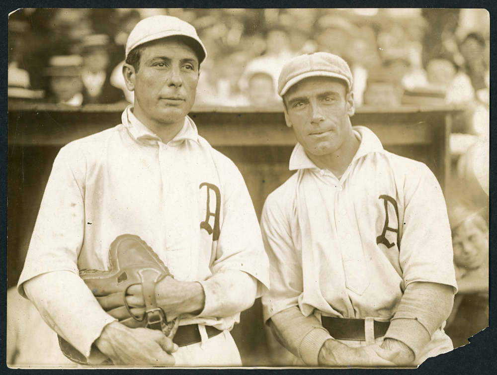 A pair of A’s catchers, Ossee Schreckengost and Doc Powers pose in front of the dugout in 1907 at Columbia Park in Philadelphia. This image is part of a recently discovered collection of 1907 A’s portraits.