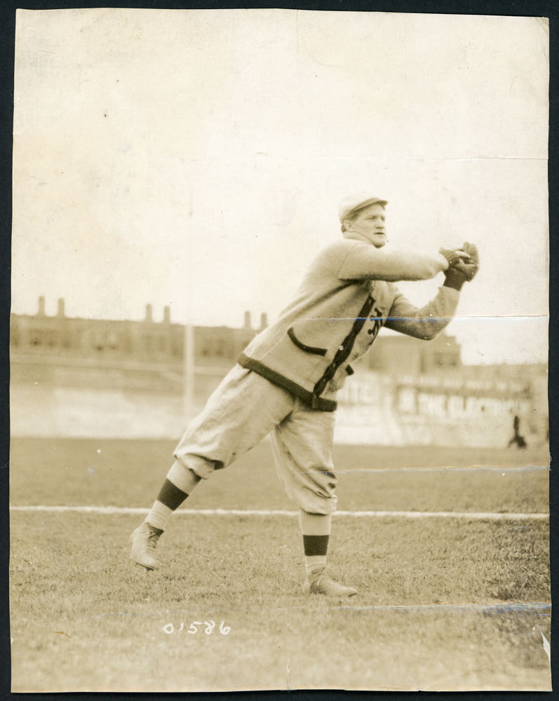 This image was taken in Baltimore at Oriole Park IV in April 1909 for an exhibition game between the Giants and the minor league Baltimore Eastern League team.
