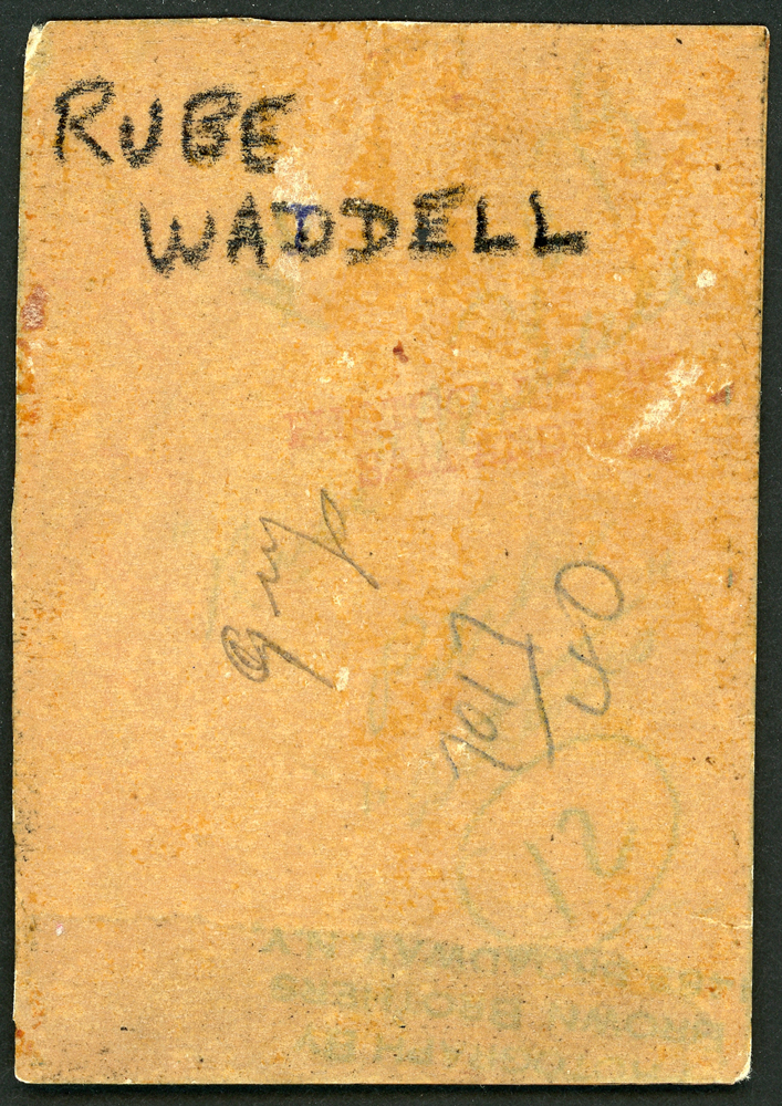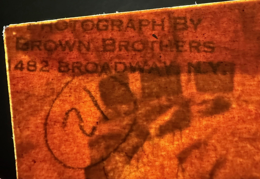 Unusual image of Rube Waddell wielding a bat for the St. Louis Cardinals. Based on the uniform, he is wearing the Browns’ road uniform, this image must be from 1908 or 1909 and is likely at Hilltop Park in New York City based on the building in the background. This print has been been been mounted to a thin paper backing which was removed from an additional mount as evidenced by the glue residue on the back. It was likely printed in the 1910s based on the period Brown Brothers stamp on back that is visible with a backlight as seen in the photo below.